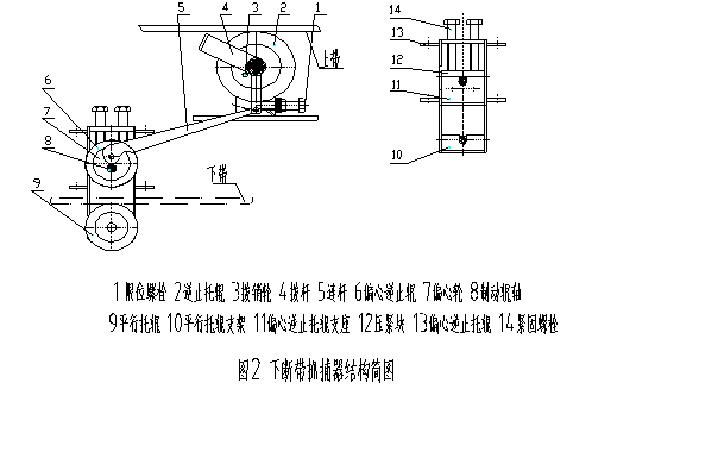 下斷帶保護裝置(見圖2)主要有逆止托輥2、平行托輥9、偏心逆止托輥6、制動連桿5、撥桿4等組成,偏心逆止托輥內(nèi)裝有偏心輪6、制動輥軸8及偏心輪傳動機構(gòu),逆止托輥裝有撥銷輪3及傳動機構(gòu)。
