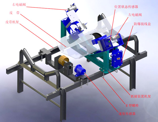 主要特點: 該產品為機電一體化智能型產品,可根據用戶皮帶機的實際運行狀況,通過控制主機(PLC)進行編程,滿足用戶要求,在皮帶安全下滑距離內,不對皮帶進行抓捕。 控制主機選用西門子可編程控制器(PLC),可實現與中控室通訊,與礦山智慧物聯網系統組網,實時監(jiān)控皮帶機的工作狀態(tài)。 通過控制程序實現自動分析皮帶是蠕動下滑倒帶還是斷帶的功能;具有故障顯示查詢、聲光報警功能,可采用多種操作模式。 抓捕皮帶的執(zhí)行機構為一組左、右對稱的敞開式凸輪壓帶方式,體積小,結構緊湊。抓捕皮帶的夾緊力隨著皮帶下滑位移的增大而增加。 該執(zhí)行機構的凸輪壓帶部分為高分子復合材料一次注塑成形,具有強度大、韌性好、重量輕等特點,能保證在抓捕皮帶時與皮帶緊密接觸,防止打滑,不損傷皮帶。 采用沿線多點布置,當速度傳感器檢測到皮帶運行異常(斷帶、倒帶)時,沿途布置的所有斷帶抓捕裝置同時動作,抓捕指令準確無誤,抓捕動作一致,可靠。 該產品具有人工試驗功能,可隨時在現場進行抓捕動作試驗。 獨有的位置狀態(tài)傳感器可實時檢測斷帶抓捕裝置的工作狀態(tài)。